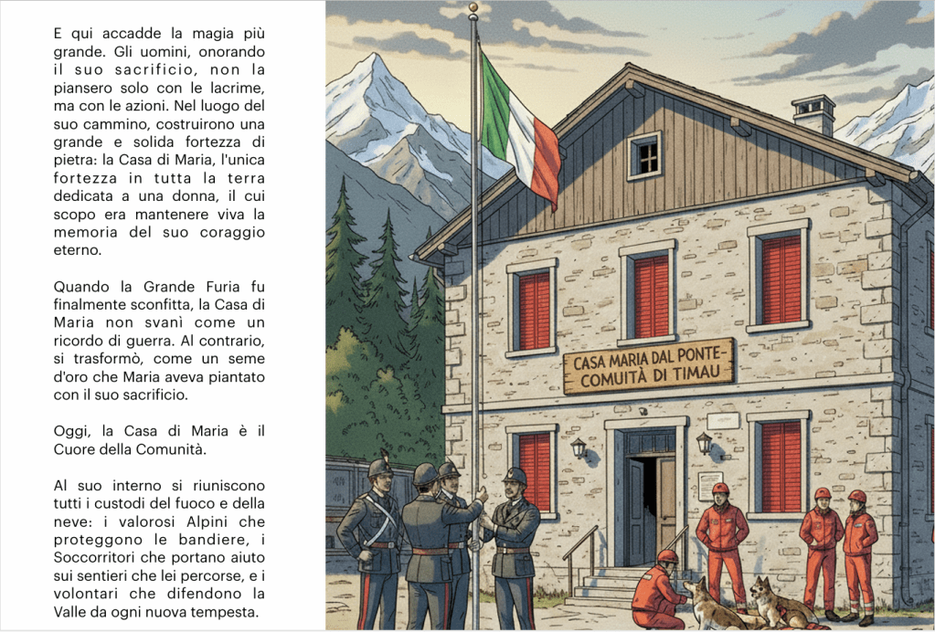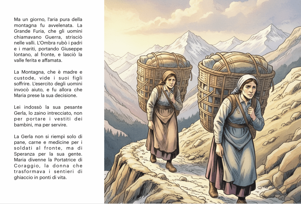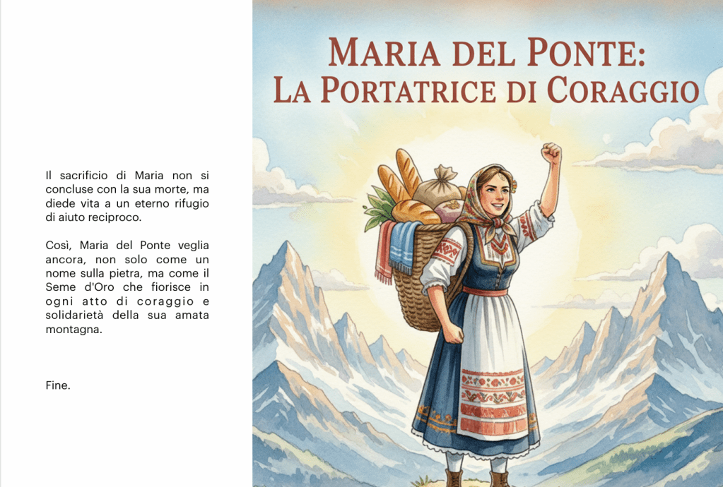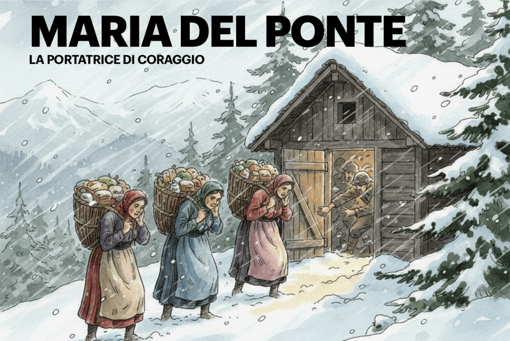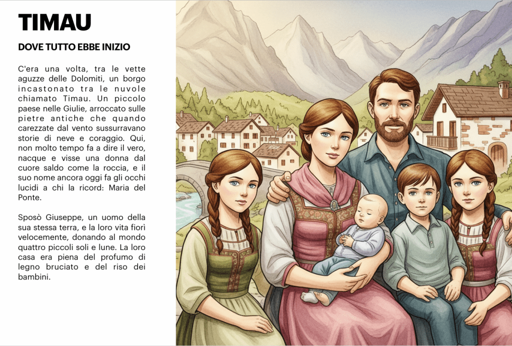 C’era una volta, tra le vette aguzze delle Dolomiti, un borgo incastonato tra le nuvole chiamato Timau, dove le pietre antiche sussurravano storie di neve e coraggio. Qui nacque e visse una donna dal cuore saldo come la roccia, di nome Maria del Ponte. Sposò Giuseppe, un uomo della sua stessa terra, e la loro…