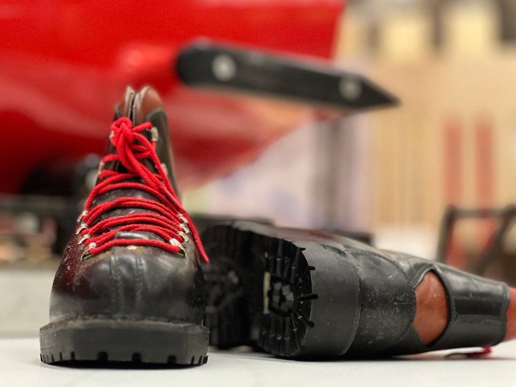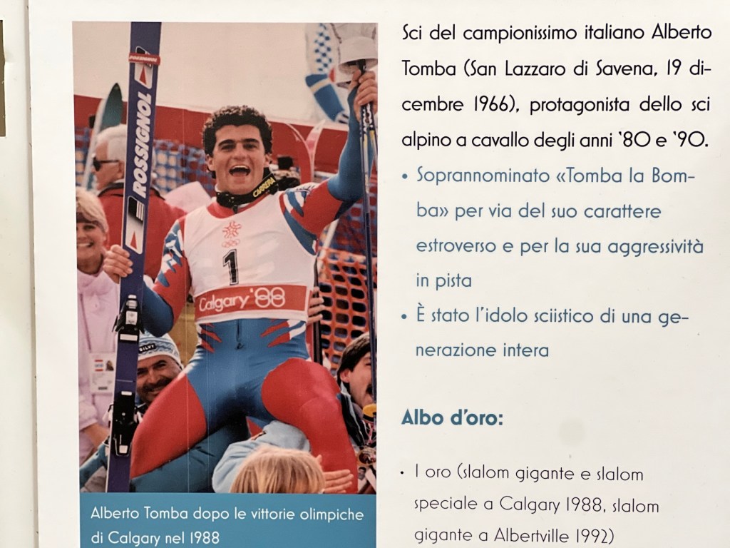 Ci si sofferma a osservare gli sci della velocità belli larghi e pesanti, fatti per dare stabilità con le lame ai lati, che servono per fare curve e frenare. E anche gli scarponi sono rigidi e bloccano sia punta che tallone, così lo sciatore ha più controllo in discesa. A guardare quelli degli anni 40/50 messi sotto l’immagine di Colò pensieri e immaginazione diventano un turbinio di racconti e emozioni.